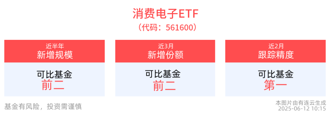 规模方面,消费电子ETF近半年规模增长2441.75万元,实现显著增长,新增规模位居可比基金2/5。